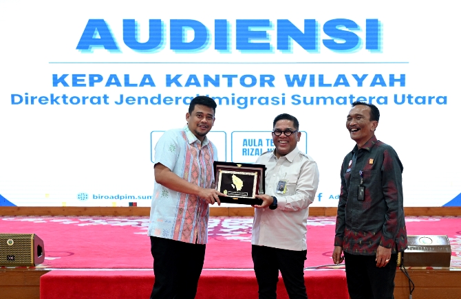 Hal tersebut disampaikan Bobby saat menerima audiensi Kepala Kantor Wilayah Direktorat Jenderal Imigrasi Sumut, Parlindungan, beserta jajaran di Aula Tengku Rizal Nurdin, Jalan Sudirman No. 41, Medan, Kamis (23/4/2026). Pertemuan ini membahas penguatan kolaborasi dalam penanganan pengungsi luar negeri serta peningkatan fasilitas layanan imigrasi di wilayah Sumut.