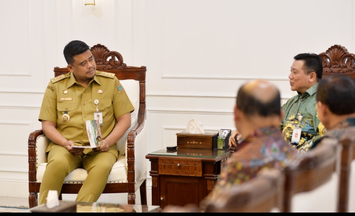 TERIMA: Gubernur Sumatera Utara (Sumut) Bobby Nasution menerima kunjungan kerja Deputi Bidang Pembangunan Wilayah Kementerian PPN/Bappenas, Dirjen Bangda Kemendagri dan Deputi Bidang Koordinasi Penanggulangan Bencana dan Konflik Sosial Kemenko PMK di Ruang Kerja Lantai 10 Kantor Gubernur Sumut Jalan Diponegoro Kota Medan, Senin (9/3/2026).