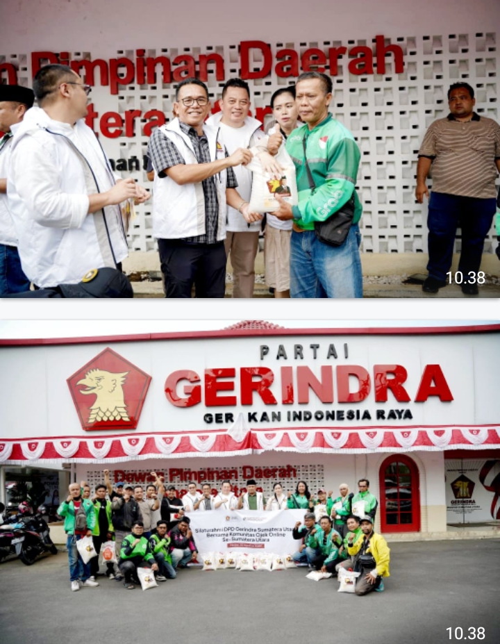 MEDAN – Dewan Pimpinan Daerah (DPD) Partai Gerindra Sumatera Utara menggelar silaturahmi bersama komunitas ojek online (ojol) se-Sumatera Utara, sekaligus menyalurkan bantuan 1.000 paket beras