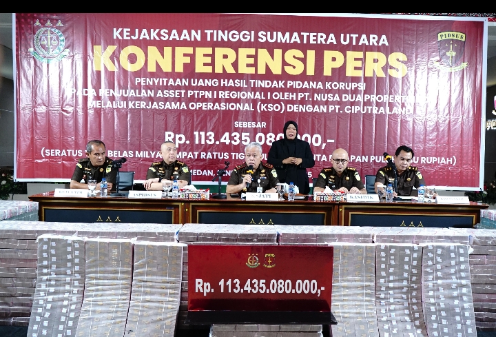 “Hari ini tim penyidik kembali menyita Rp113.435.080.000 dari PT NDP dalam perkara dugaan korupsi terkait penjualan aset eks PTPN 2 lewat Kerja Sama Operasional (KSO) ke PT Ciputra Land,” urai Kajati Dr Harli Siregar dalam keterangan persnya.