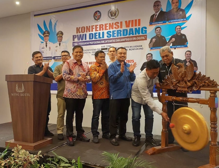 BUKA: Wakil Bupati Deli Serdang Lom Lom Suwondo saat memukul gong tanda dimulainya Konferensi PWI ke VIII 2025 Kabupaten Deli Serdang. (ist/sadamanews.com)