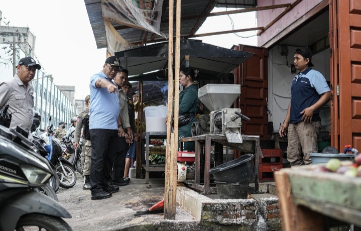 SOSIALISASIKAN: Bupati Deli Serdang, dr H Asri Ludin Tambunan mensosialisasikan imbauan kepada pedagang di Pasar III, Lubuk Pakam, untuk tidak berjualan di atas trotoar di sela-sela gotong royong massal, Jumat (30/1/2026). Para pedagang disarankan untuk memanfaatkan relokasi yang telah disediakan Pemkab Deli Serdang di Pasar Bakaran Batu. (Foto Diskominfostan Deli Serdang)