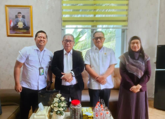 DUKUNG: Ketua DPRD Kota Gorontalo Irwan Hunawa, S.AP didampingi Wakil Ketua DPRD Lola Mayulu Junus, S.Mn., M.H, foto bersama dengan Kepala Cabang BPJS Ketenagakerjaan Provinsi Gorontalo Dr. Ir. Sanco Simanullang, S.T., M.T., IPM, ASEAN Eng. (ist/sadamanews.com)