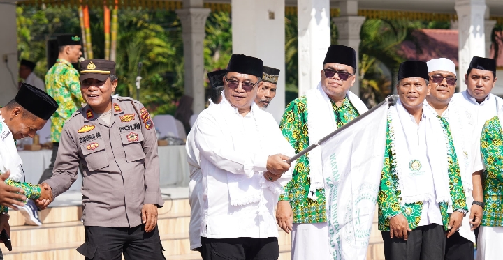 LEPAS: Asisten I Pemerintahan dan Kesejahteraan Rakyat, Drs Zainal Abidin Hutagalung MAP melepas peserta Manasik Haji Akbar MDTA ke-14 Tahun 2026 M/1447 H yang digelar IGDT Deli Serdang di Alun-Alun Kabupaten Deli Serdang, Minggu (1/2/2026).