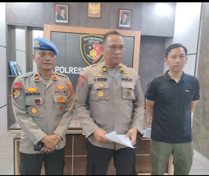 AMANKAN: Kasat Reskrim Polrestabes Medan, AKBP Adrian Risky Lubis didampingi, Kasi Propam Kompol Raymond Hutagalung dan Kasi Humas, AKP Nover Gultom saat memberikan keterangan kepada wartawan. (ist/sadamanews.com)