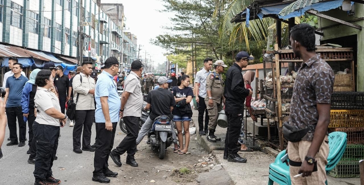 TINJAU: Bupati Deli Serdang, dr H Asri Ludin Tambunan meninjau gotong royong massal di Pasar III, Lubuk Pakam, sekaligus menyosialisasikan kepada para pedagang untuk tidak lagi berjualan di atas drainase atau trotoar, Jumat (30/1/2026).