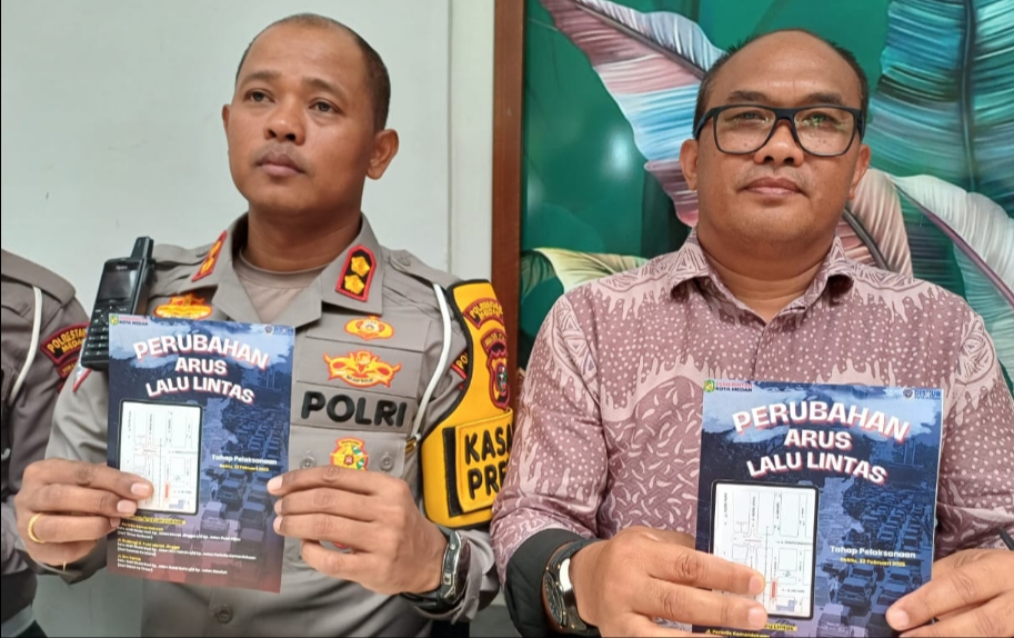 UBAH: Kasat Lantas Polrestabes Medan, AKBP I Made Parwita (kiri) dan Plt Kadis Perhubungan Kota Medan Suriono (kanan) saat memberikan keterangan pers. MEDAN – Pemerintah…