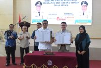 TANDA TANGANI: Bupati Deli Serdang, dr H Asri Ludin Tambunan menandatangani nota kesepahaman atau MoU dengan enam mitra strategis di Aula Cendana, Lantai II,…