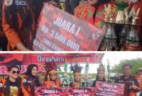 SERAHKAN: Madila Gayo ‘Icha’, istri Ketua MPC PP Deliserdang, Junaidi saat menyerahkan trophy juara I lomba senam kreasi (atas). Bawah, Icha didampingi Melda Sembiring…