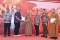 SERAHKAN : Bupati Deli Serdang, dr H Asri Ludin Tambunan saat menyerahkan SK kepada Bhiksu, Dharma Virya Mahasthavira. (ist/sadamanews.com) SIBOLANGIT – sadamanews.com – Vihara…