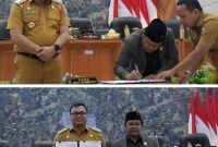 SAKSIKAN : Bupati Deli Serdang, dr H Asri Ludin Tambunan menyaksikan penandatanganan persetujuan bersama Rancangan KUA-PPAS APBD Deli Serdang tahun 2026. Bawah, Bupati Deli…