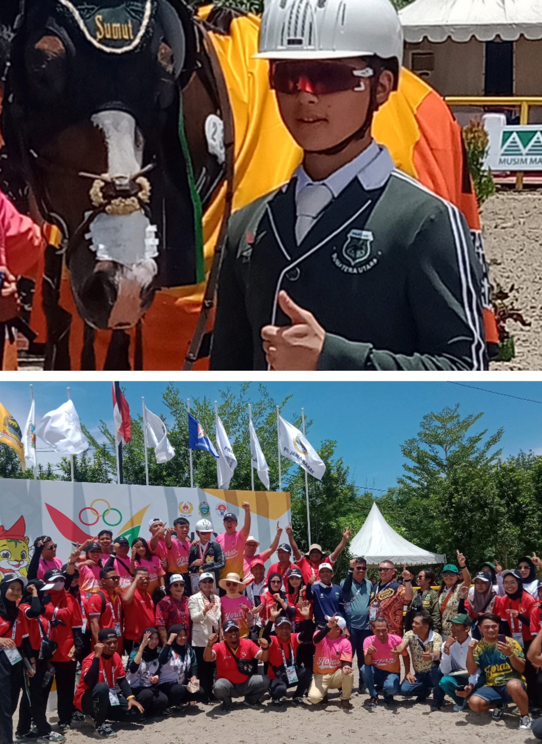 FOTO BERSAMA: Nustrdinov Jayan Patih foto bersama dengan Triwatty Marciano, Corry Sriwaty Sebayang, pengurus Pordasi Sumut usai mengalungkan medali. SERGAI – Atlet berkuda Sumatera…