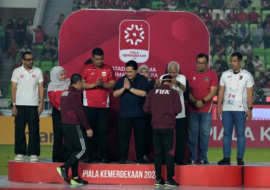 Diskominfo Sumut / YT Hariono BERIKAN: Gubernur Sumatera Utara {Sumut} Bobby Afif Nasution bersama Ketua PSSI Erick Thohir memberikan piala kepada pemenang Piala Kemerdekaan…