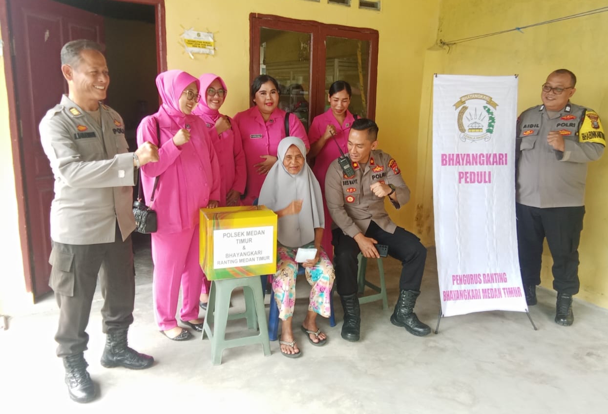 BANTU: Kapolsek Medan Timur, Kompol Briston AM Napitupulu ST SIK foto bersama personil dan warga penerima bantuan. MEDAN – Polsek Medan Timur bersama Bhayangkari…