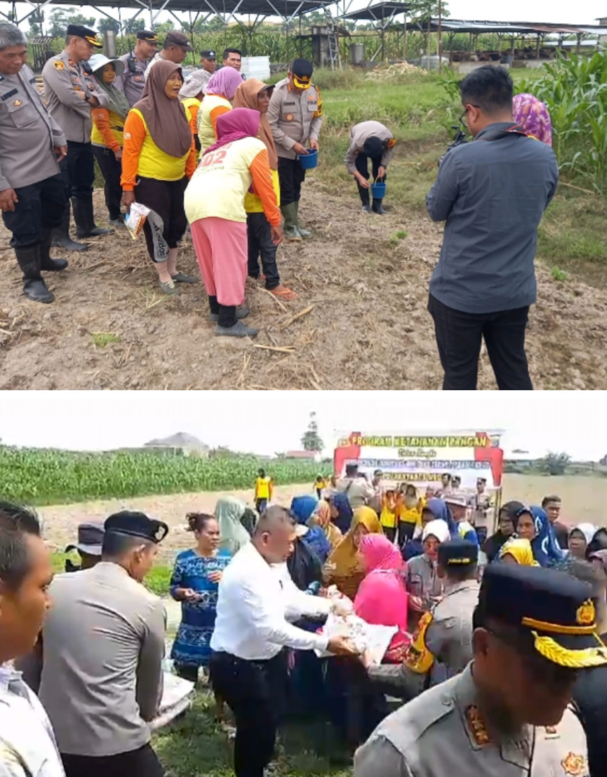 TANAM: Kapolrestabes Medan saat menanam jagung dan bawang merah di Dusun 2 Desa Bandar Klippa. Bawah, Junaidi saat memberikan bantuan beras ke warga. MEDAN – Guna…