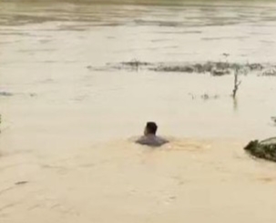 SELAMATKAN: Briptu Johannes berenang untuk menyelamatkan lansia yang terjebak banjir. DELISERDANG – Terjebak di ladangnya yang terendam banjir sedalam lima meter, Pak Ucok (70)…