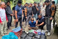 AMANKAN: Kasat Narkoba Polrestabes Medan, Kompol Rafli Yusuf Nugraha (jongkok) didampingi Kanit 3, Iptu Berry Anggara (kanan pake jaket) menginterogasi tersangka dan terlihat barang…