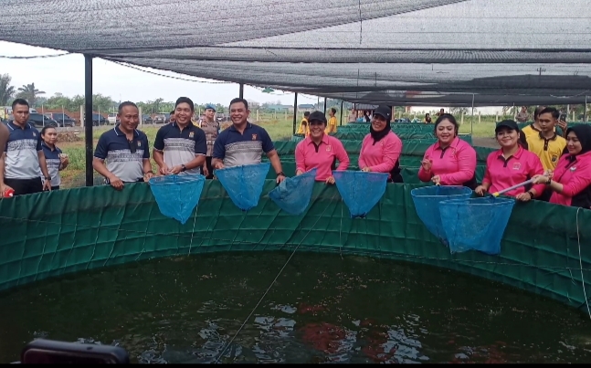 PANEN: Kapolda Sumut Irjen Whisnu Hermawan Februanto bersama Wakapoldasu Brigjen Pol Rony Samtana dan pengurus Bhayangkari Sumatera Utara memanen perdana ikan lele, Jumat (28/2)….
