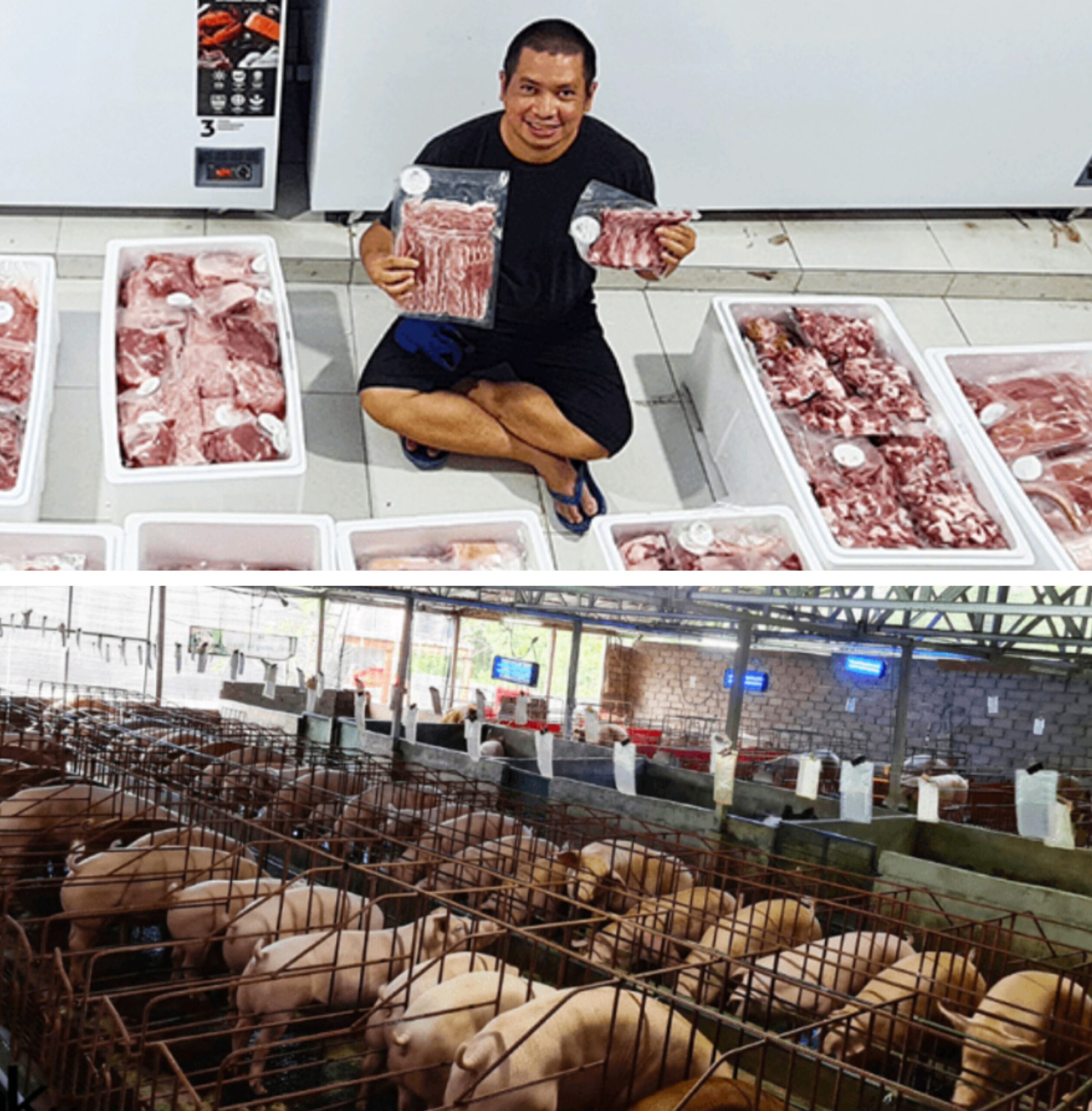 SUKSES: Daging babi yang akan dijual (atas). Bawah, peternakan babi Natalia Farm. BALI – Natalia Farm, menjadi salah satu industri peternakan babi yang sukses…