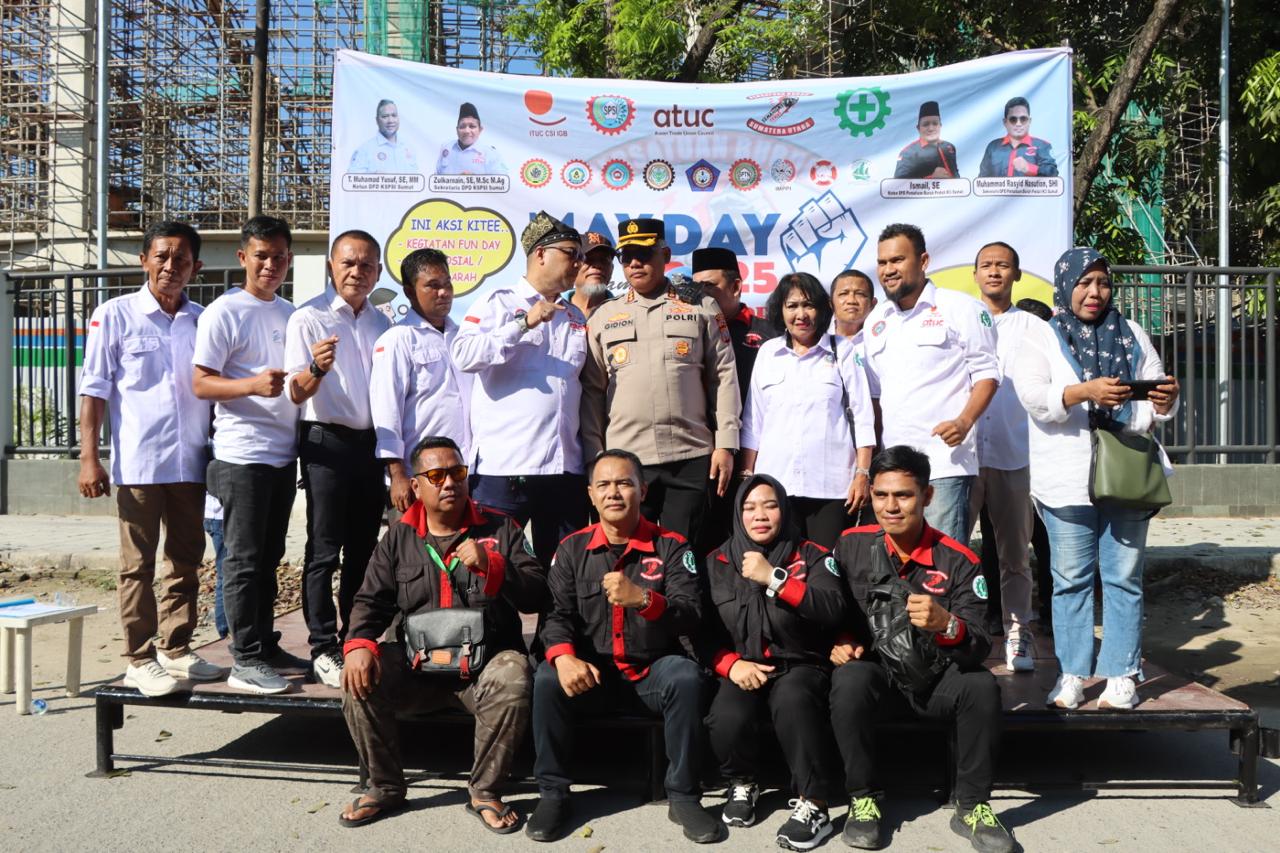 DIJAGA: Kapolrestabes Medan, Kombes Pol Gidion Arif Setyawan foto bersama buruh. MEDAN – Ribuan buruh dari berbagai elemen buruh berkumpul di delapan titik, merayakan…