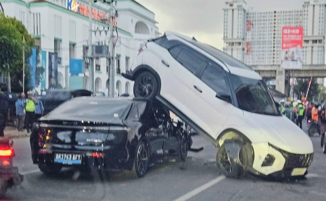 TIMPA: Salah satu mobil menimpa mobil lainnya saat kecelakaan beruntun di Jalan HM Yamin, Kecamatan Medan Timur, Senin (26/5/2025). MEDAN – Kecelakaan beruntun yang…