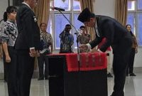 LANTIK: Bupati Tapanuli Utara, Dr. Jonius Taripar Parsaoran Hutabarat, S.Si., M.Si saat melantik Henry Maraden Masista Sitompul Sekretaris Daerah di aula Martua Kantor Bupati…