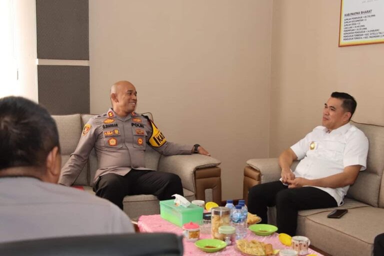 BERBINCANG: Pjs Bupati Pakpak Bharat, Dr. Naslindo Sirait, SE, MM berbincang dengan Kapolres Pakpak Bharat, AKBP Oloan Siahaan, S.I.K., M.H di ruang kerjanya. SALAK…