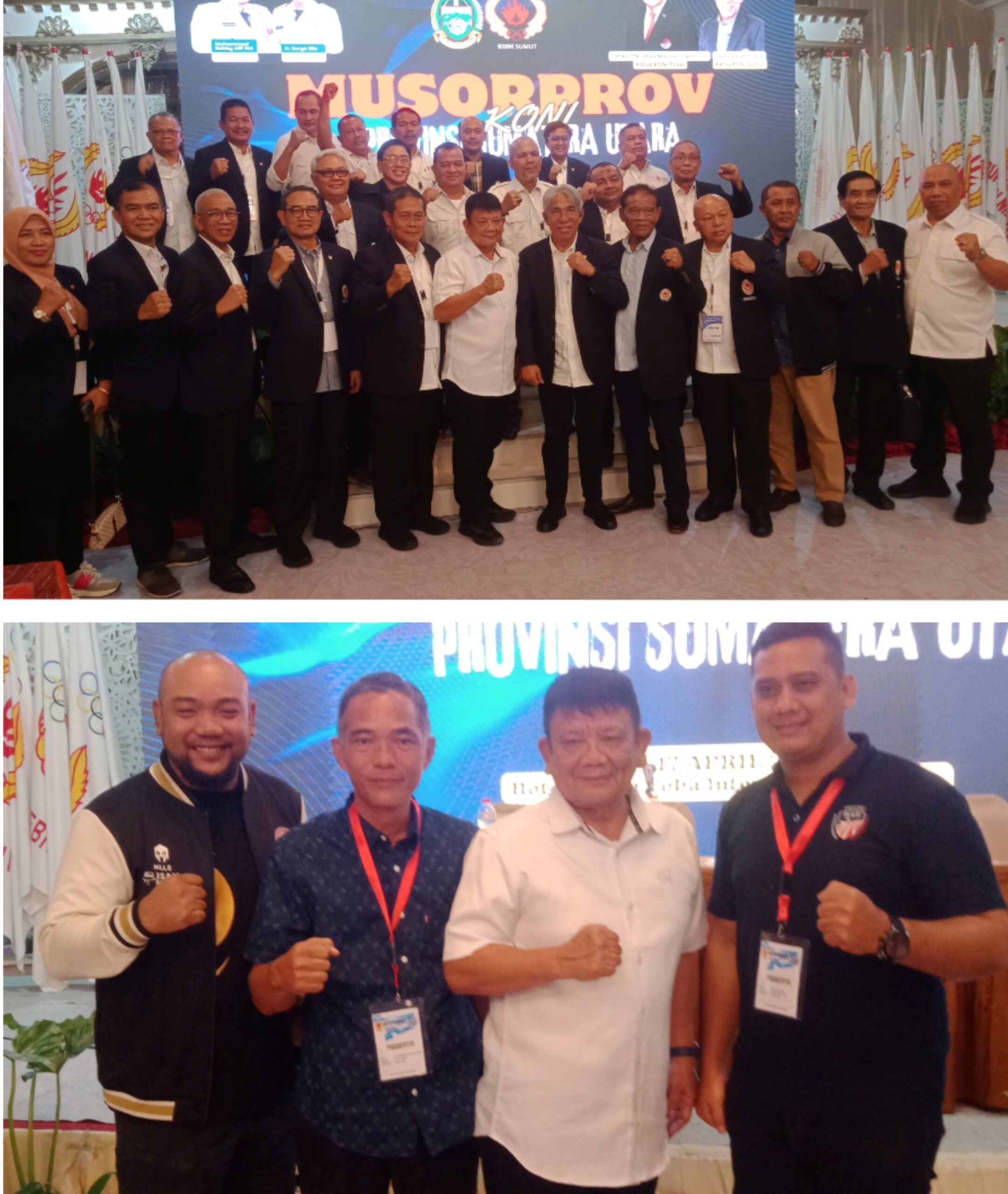 FOTO BERSAMA: Hatunggal Siregar, John Lubis foto bersama dengan pengurus KONI Sumut lainnya. Dan bawah, Hatunggal Siregar foto bersama dengan Ketua Pengprov IKASI Sumut,…
