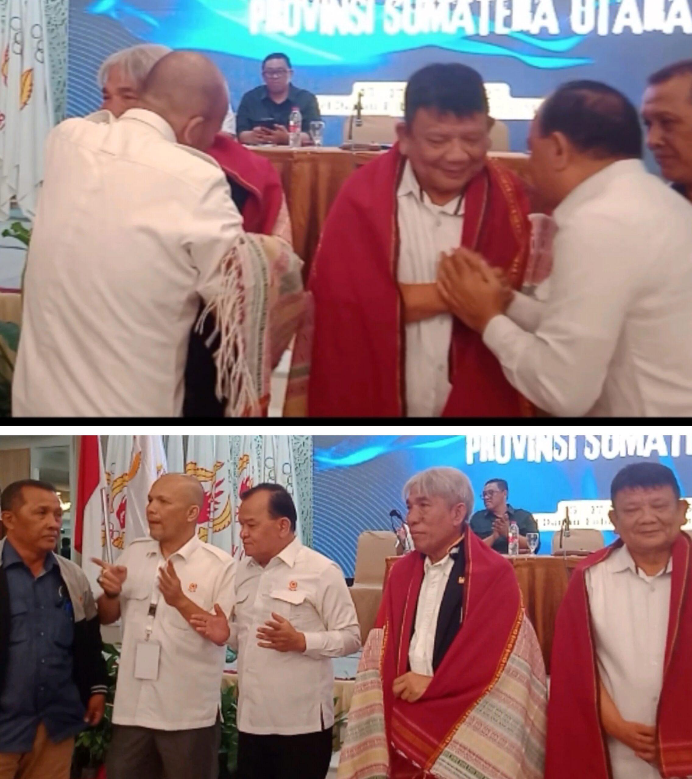 BERIKAN: SIWO PWI Sumut memberikan ulos kepada Ketua KONI Sumut sebelumnya John Lubis dan Ketua KONI terpilih Hatunggal Siregar. MEDAN – John Ismadi Lubis dan…
