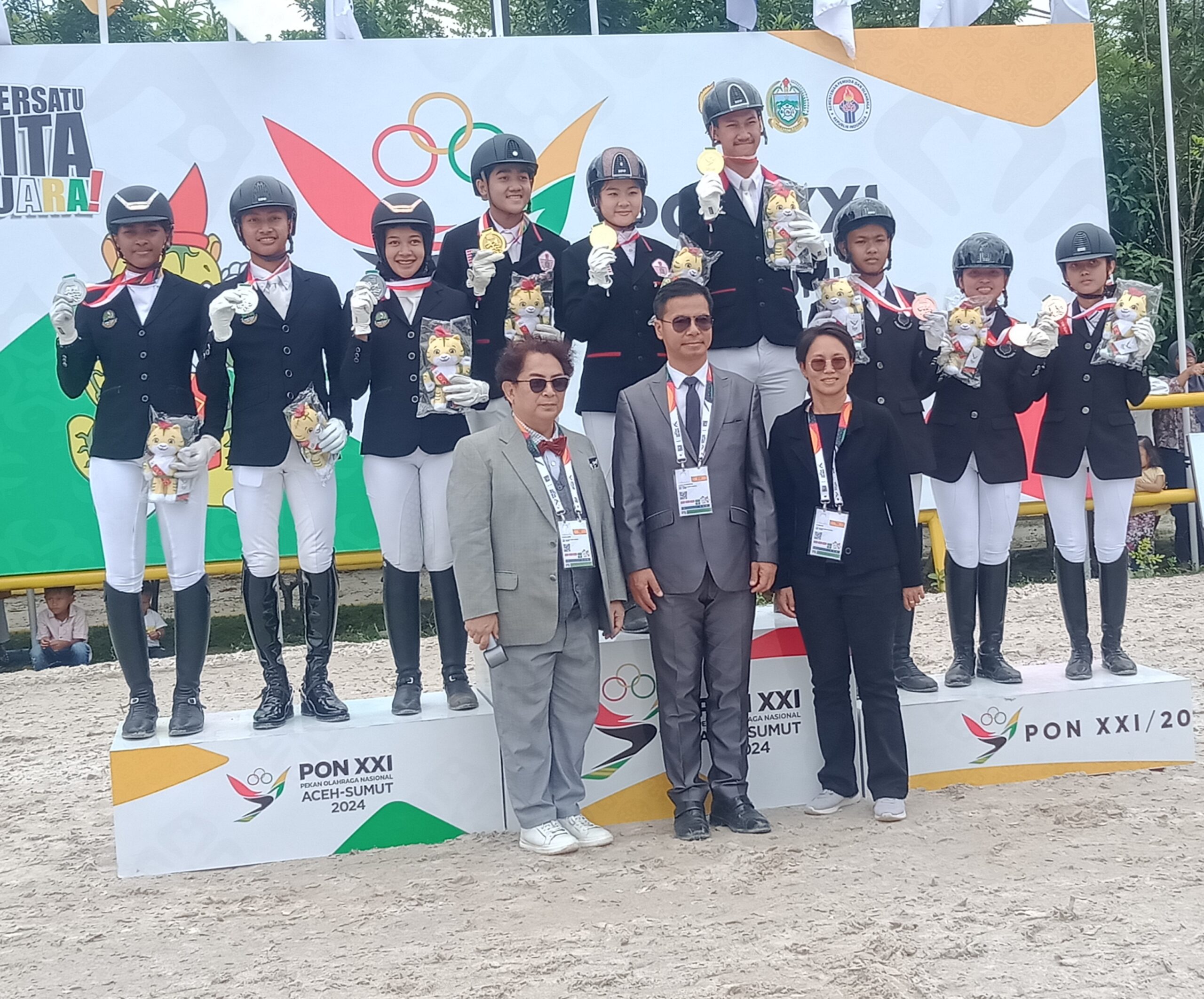 FOTO BERSAMA: Para rider foto bersama usai menerima medali. SERGAI – Rider kuda dari Yogyakarta, M Sofian meraih emas pada lomba berkuda nomor ketahanan…