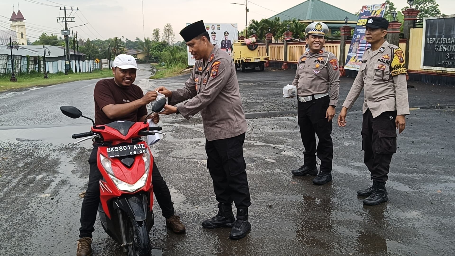 BERIKAN: Kapolsek Patumbak Kompol Faidir SH, MH saat membagikan makanan takjil buka puasa kepada para pengendara. MEDAN – Walau dilanda hujan, tidak menghalangi Polsek…