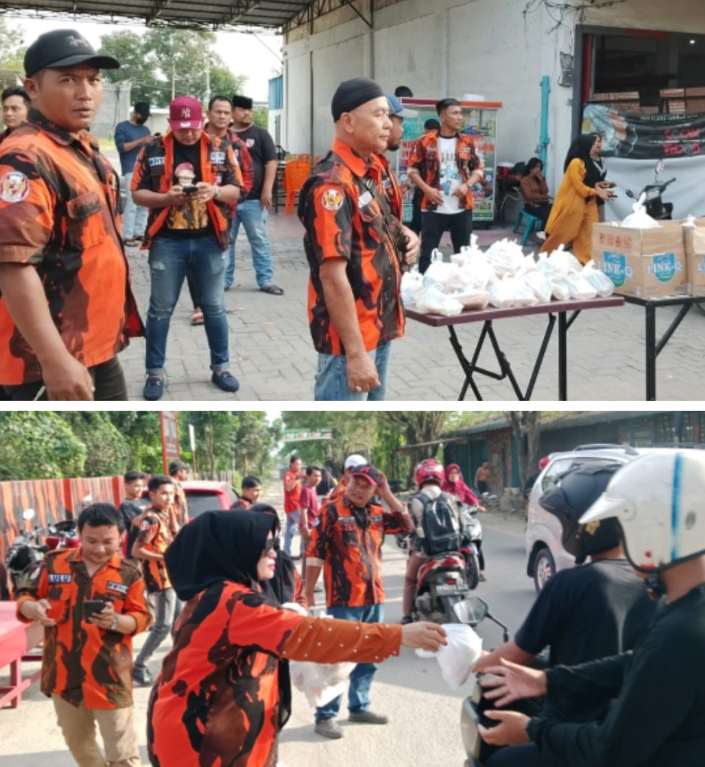 BERIKAN: Junaidi SH saat memberikan takjil pada warga. Dan bawah, Ketua PAC PP Kecamatan Hamparan Perak, Joni Irawan saat memberikan takjil. (ist/sadamanews.com) DELI SERDANG…