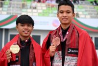 MEDALI : Pelari Indonesia asal Sumut Jakabiran Harahap (kanan) dan pelari Indonesia asal Jambi Geonly Kubalang (kiri) berpose menunjukkan medali usai Upacara Penghormatan Pemenang…