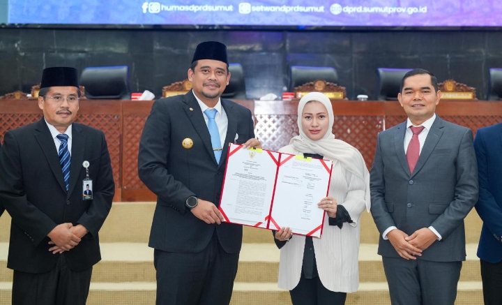 (Foto : Dinas Komunikasi dan Informatika Provinsi Sumut / Imam Syahputra). HADIRI: Gubernur Sumut, Bobby Nasution menghadiri Rapat Paripurna DPRD Sumut dalam rangka Pengambilan…